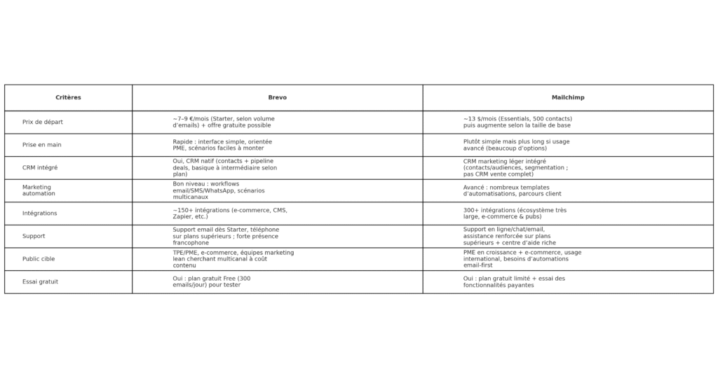 Exemple concret : Avec 5 000 contacts et 2 envois/mois, vous payez environ 75€/mois chez Mailchimp contre 25€ chez Brevo. L’économie peut atteindre 600€/an.
